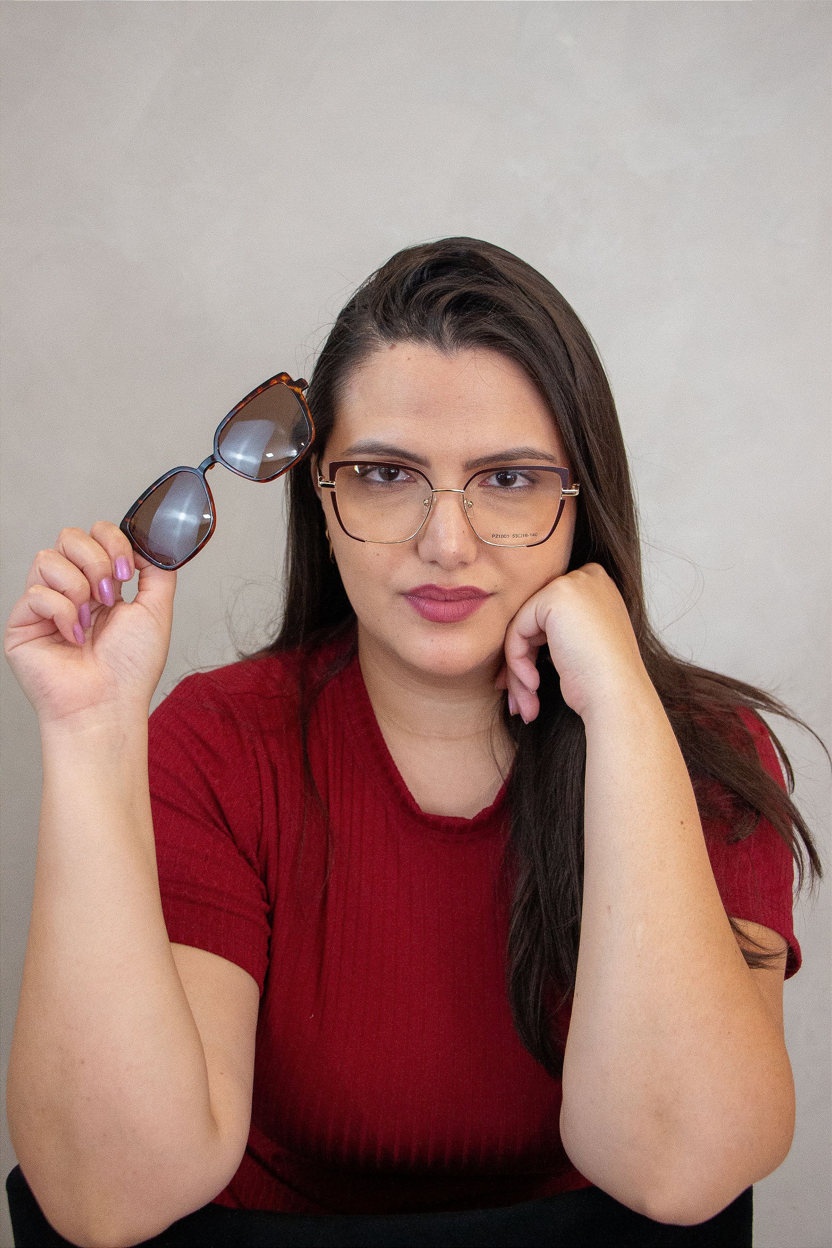 Versatilidade e estilo em um só produto! Esta armação em metal com plaqueta nasal oferece leveza, conforto e ajuste perfeito para o uso diário. Com o sistema 2 em 1, você pode alternar facilmente entre óculos de grau e óculos de sol por meio do prático clip-on magnético. Ideal para quem busca funcionalidade sem abrir mão do design moderno, é a solução perfeita para acompanhar sua rotina com elegância e praticidade.